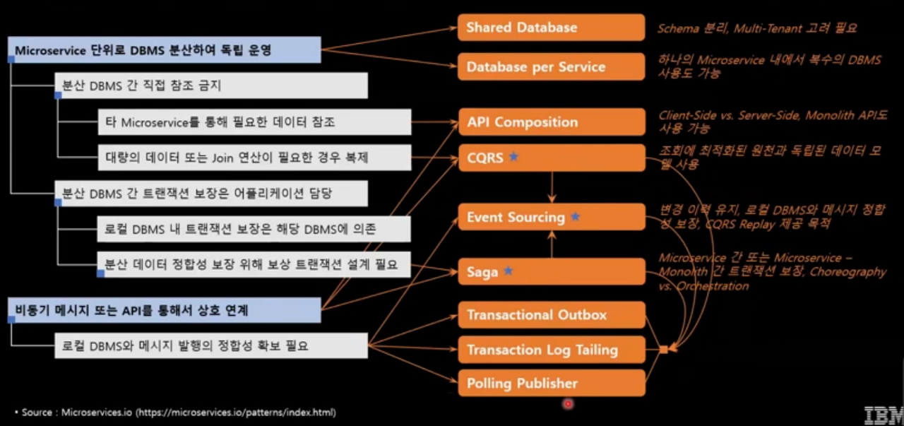 기존 모놀리틱 App를 MSA구조로 변경시 DB 분리가 될 수 있는데, 이 때 join 이 필요할 경우는 API Composition을 활용하거나, DB복제를 통해 CQRS 패턴 적용