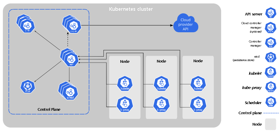 control plane component 는 cluster에 대한 전반적인 행위를 수행하고, 클러스터 이벤트를 감지하고 처리한다. 예를 들면 deployment의 replicas 필드의 요구 조건이 충족되지 않을 경우 새로운 pod를 구동시키는 행위등을 한다.