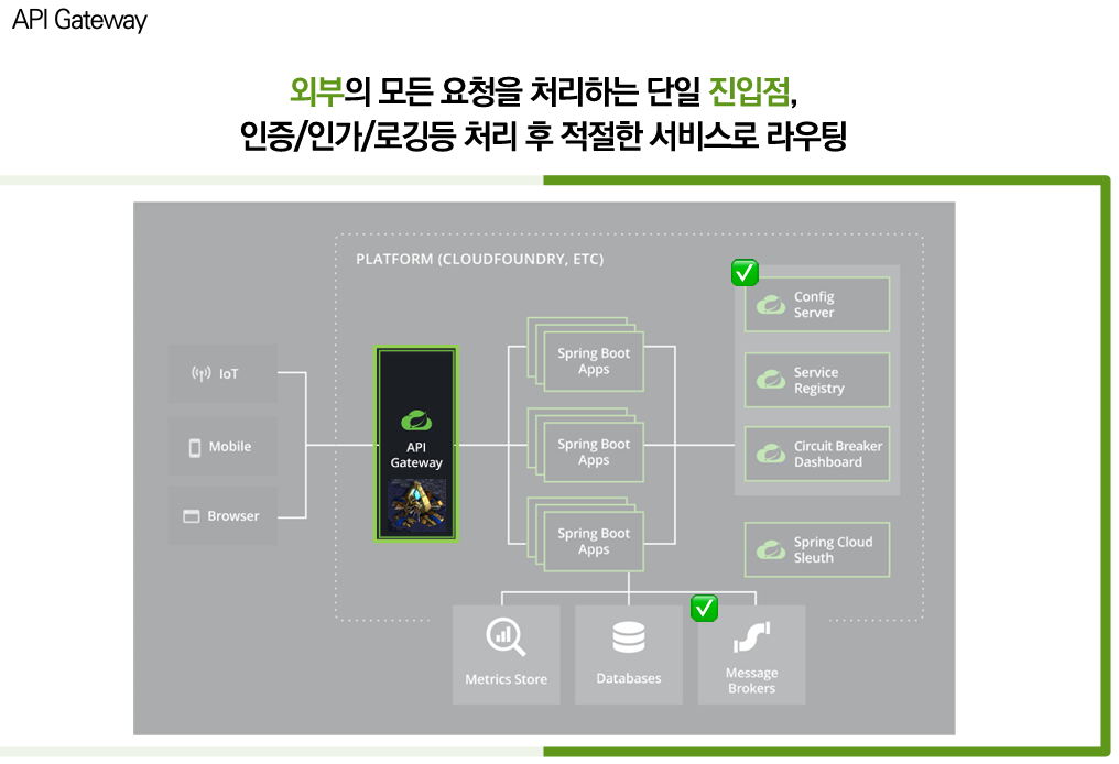 - 외부(External) 에 API Gateway를 위치하여 내부 서비스를 보호 및 제어